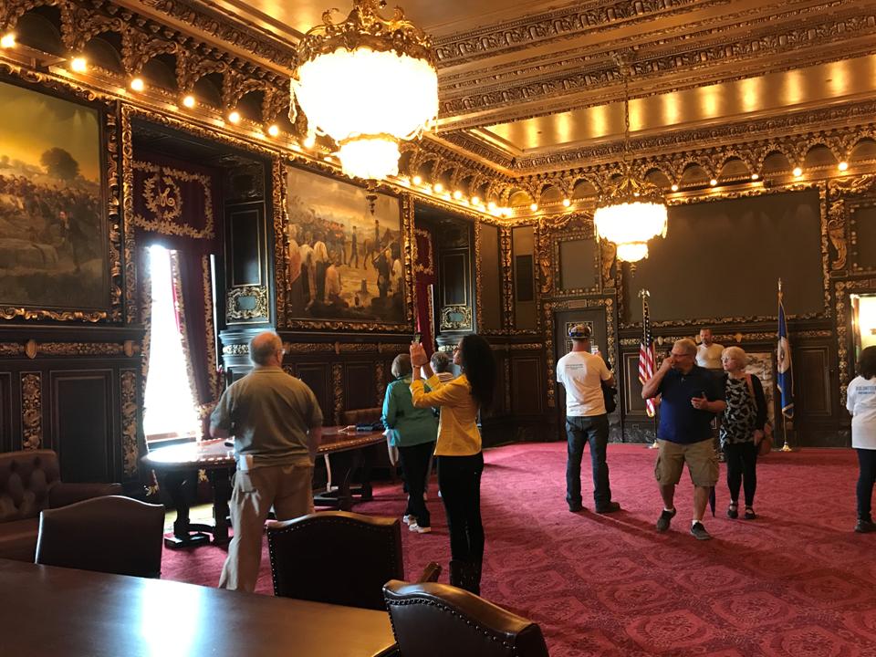 州长大人的办公室分两个部分。我首先进入的是一个富丽堂皇的大厅,这是州长签署文件,开记者招待会和会客的地方。环顾四周,大厅里既有展现明州投身南北战争的恢宏油画,又有体现明州以农业为特色的精美雕刻,甚为豪华。