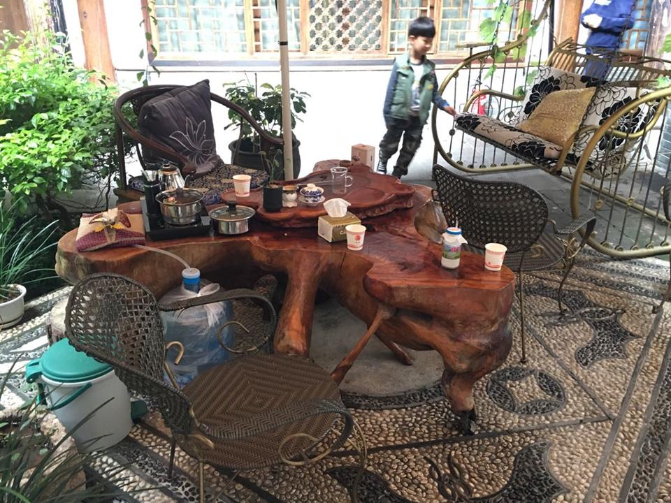 一迈进丽江少府观景客栈,我就瞥见了庭院中央的一个硕大的状如树根的茶几,上面七七八八地摆着些玲珑的茶炉、茶架、茶匙、茶壶、茶瓶什么的。