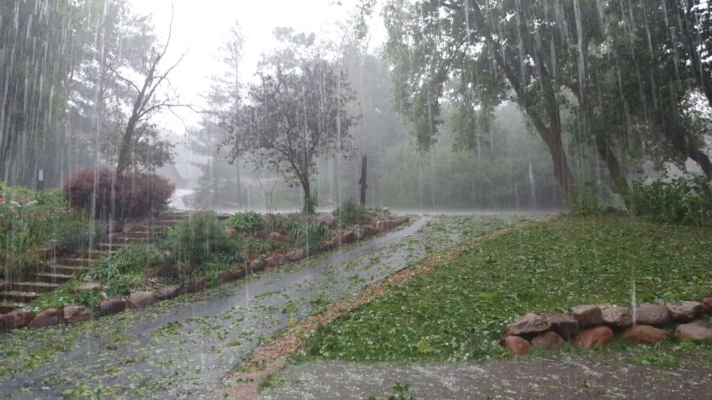 不能不惊叹气象预报的准确性。在8月6日傍晚6时半许,疾风骤雨和冰雹准时地袭击了我们小区。当高尔夫球一般大小的雹子,在空中划出一条条银色的弧线,毫不留情地砸向房顶和阳台时,我的脑里闪出的第一个词竟是“枪林弹雨”。