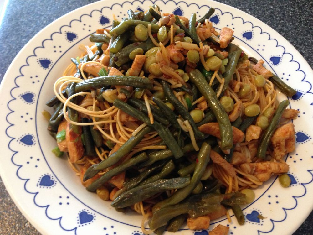 豆角、鲜面条、大蒜、葱、生抽、白糖、盐、香油。