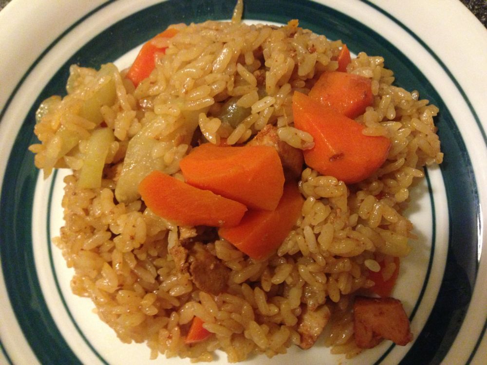 做了几次后,又开始投机取巧。光是有饭有肉没意思,还得有蔬菜才行。如是又自做主张加入了红萝卜,土豆,洋葱等食材,倒也味道浓郁,颇有风味。