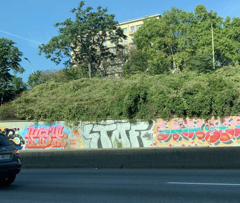 从戴高乐机场开往我们预定在市中心酒店的高速路途上,一路就看到沿着高速路两边围墙上布满了各种五颜六色大小形体不一的字母涂鸦,给单调沉闷无趣的围墙和车行驶在高速路程上的时间上平添了不少的色彩和活力和惊喜!