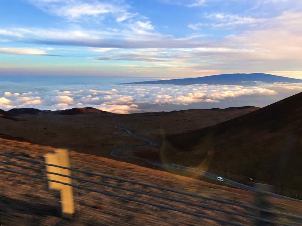 抵达大岛第一晚,就迫不及待开上了ManauKea火山。前面说过希洛一年360日有雨,偏这天风和日丽,一口气开到8000英尺的游客中心,轻松惬意,完全没有朋友口中和网上描述的惊心动魄,望着脚下云海茫茫,我俩笑着说soeasy,[