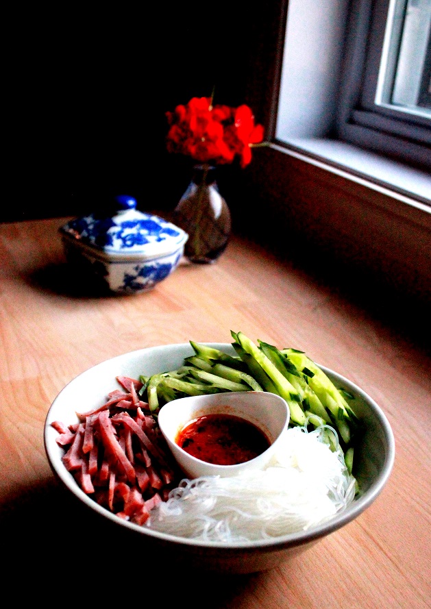 材料:粉丝(我爱用江西粉,很筋道,不会煮碎掉),黄瓜,波兰红肠(costco买的,不喜放肉的可以不放)