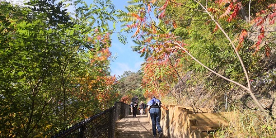 这是一个异常宽阔平坦的峡谷,游客当中不仅有拖家带口的,还有推婴儿车的,甚至还有一队可爱的幼儿园小朋友来秋游。