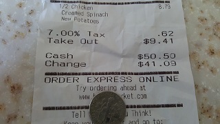 前几天去连锁快餐店买外卖,收银小姐啪啪打了几下键盘,电脑显示总额是$9.41。我当时想换开一张$50的,又不想拿回一堆硬币,手里没有41分,就递给她$50.51。小姑娘接过钱,左手拿纸钞,右手心摊开硬币,左看看,右看看,就是不把数额往电脑里打。得,怎么碰到一个好学的孩子呢,明明有电脑,非要用心算,我可不是要故意为难谁啊。