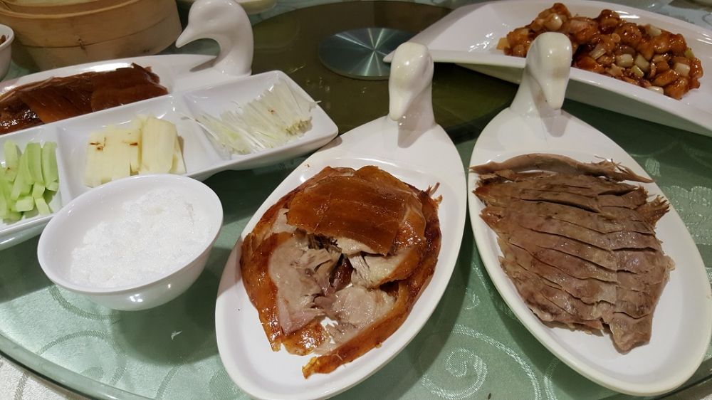 跟长辈们出去,菜式比较经典,比如总是少不了比较高档的烤鸭,加上家常的宫爆鸡丁和酱烧茄子,最后加个庙会小吃——灌肠,全套完成。近年好像流行鸭皮沾白糖,比起我熟悉的葱丝、黄瓜条沾甜面酱,这种据说更[