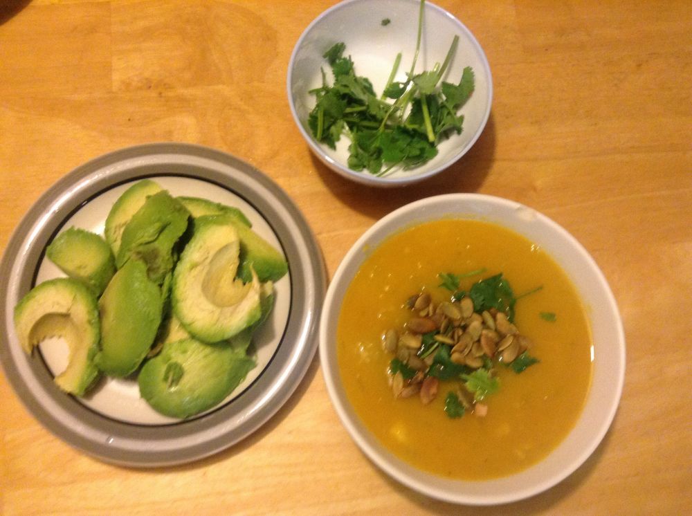材料:一个4-5磅的南瓜,,一个中等大小的黄元葱,3瓣大蒜,一茶勺桂皮粉,3罐鸡汤(Sam's买的chickenbroth),一个青柠檬,四根香菜,烤熟的南瓜籽和奶油果。