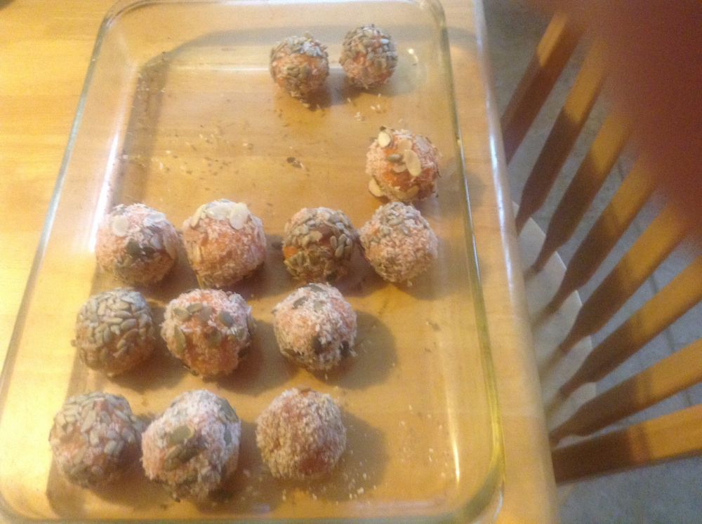 捏2-3cm的球,在椰蓉和南瓜籽和葵花籽中滚动。