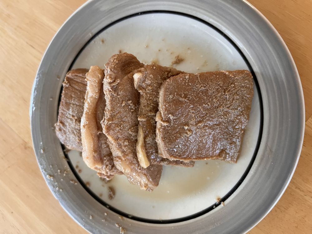 Sam买的猪里脊肉,切大片,放锅里煮,撇去浮末,放适量米酒or白葡萄酒、葱姜、酱油、一个卤包、一大勺大酱、一个桂皮和适量盐。煮一个小时即可食用。