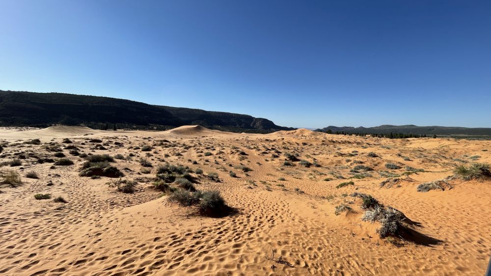 去Zion公园的路上,看到旁边有一个公园写着:PinkSandStatePark,(粉沙子公园)我们挺好奇,就拐了进去。开了大概半个小时,看见了小公园的入口。可是在外头怎么看也没看见粉色的沙子。我说咱们走吧,领导说已经来了,进去看看吧。说不定换个角度就能看见粉红色的沙子了。进去一看,就是普通的黄色沙子,怎么看都没看见一点点粉红的颜色。我们不是学地质的,[