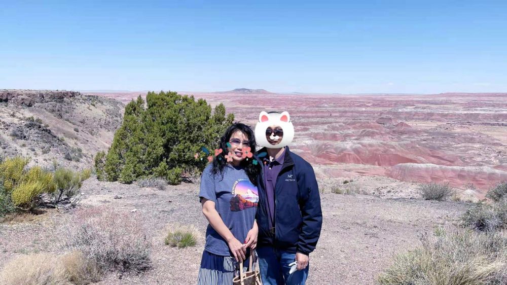 神木化石公园有两个入口,南门在180公路上,北门在40公路上。我们决定从北门进入。进公园的时候时间还早。在游客中心门口留影的时候,发生了很奇怪的事情。照片里清清楚楚出现了两道彩虹。怎么调角度这两道彩虹都在。当时还有两对白人老夫妇让我们帮忙拍合影,他们的照片就看不出异样,其中有一张照片有一只清晰的眼睛把我的身影整[