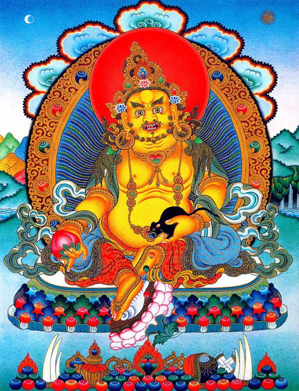 黄财神,藏名藏拉色波,是密教之护法神祗,诸财神之首。黄财神是藏传佛教各大教派普遍供养的五姓财神之一,因其身肤黄色,故称为黄财神。相传黄财神过去是位菩萨,早已修证五道十地。昔日释迦牟尼佛在中印度摩陀国之灵鹫山讲说大般若经义时,诸方魔鬼神怪前来阻碍,令山崩倒塌,此时黄财神奋勇现身庇护,使得众多闻法[