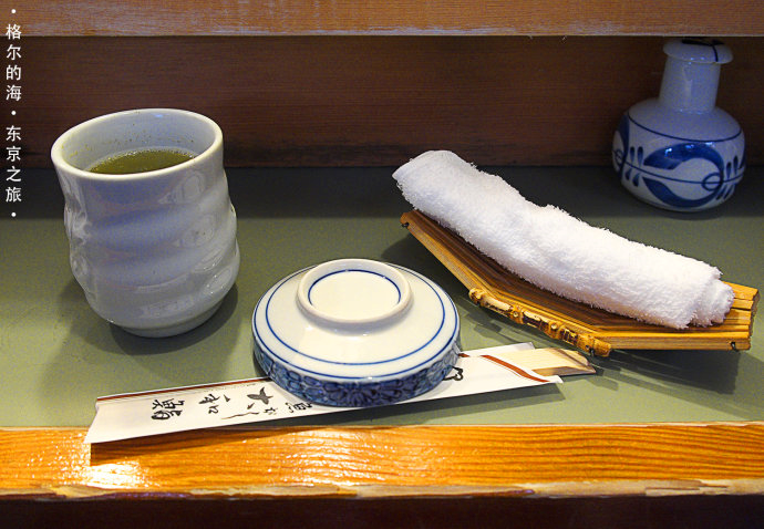 等了1个多小时,终于轮到我们了。坐下来,先给我们上了一杯抹茶,一双筷子和一条湿手巾。这杯抹茶特别好喝,就让我想到以后也改喝抹茶。抹茶的好处就是可以把磨碎的绿茶叶子连茶一起喝下去。不明白为什么明朝人民从抹茶改成喝泡茶,或者说就算喝泡茶,也别彻底抛弃喝了几百年的抹茶传统嘛。
