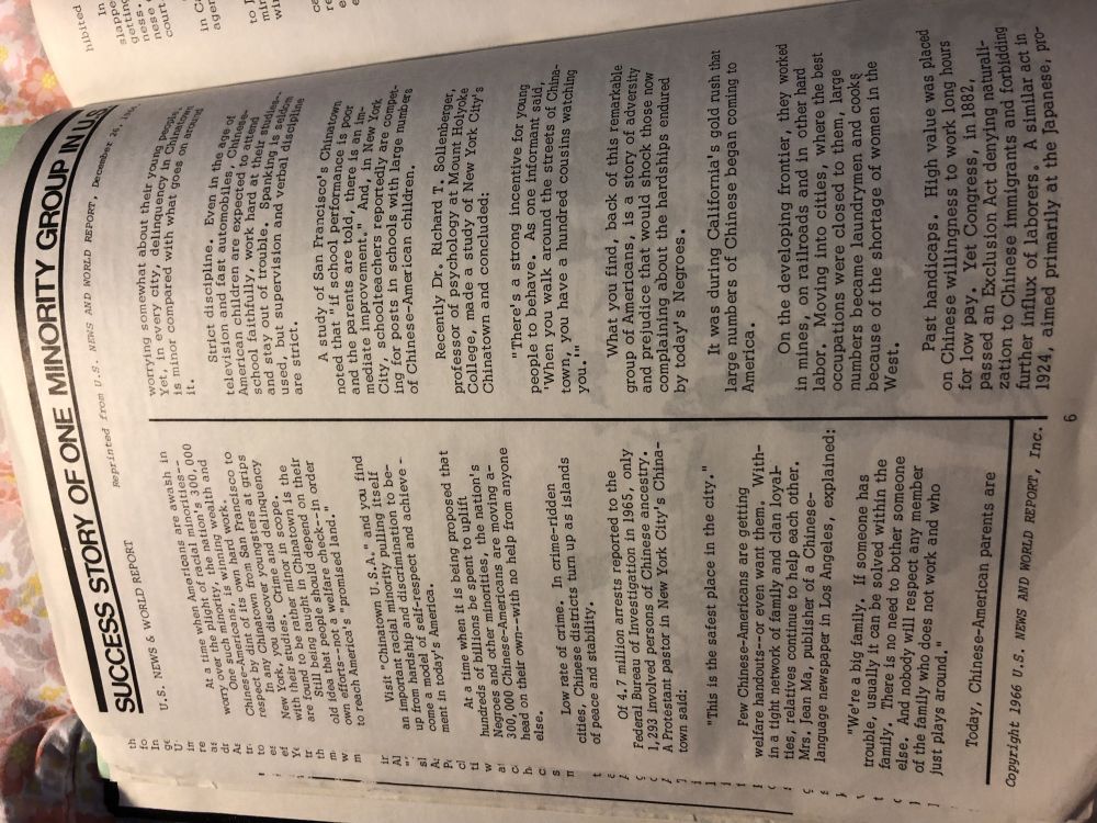 中国移民:五十年从模范少数族群沦为票房毒药周末在愽物馆读到一本书:Roots:AnAsianAmericanReader.是一九七一年加州大学出版的第一部研究亚州移民的专著。该著收集了有关美国亚裔特别是中国移民最早的一批研究论文。该著收集的第一篇文章是一九六六年十二月二十六日《美国世界新闻报道》杂志社刊登的“SuccessstoryofoneminoritygroupinUSA“.将生活在美国的中国人称之为美[