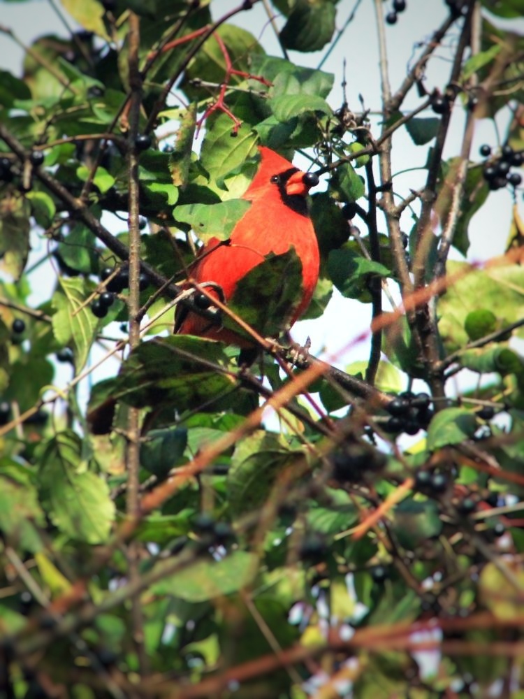 最先看到的是一种红鸟,以前走步时见过,但从来沒细看。拉近景后,鸟儿看起来通体红色,头上竖的一撮毛像是一[