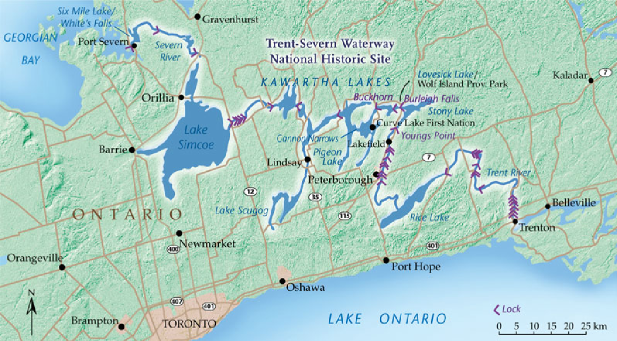 最南边的一条是夏天去过的从东到西横贯尼亚加拉半岛的Welland运河,最短但最宽,能过三千吨位的货轮。这次要说的Trent-Severn运河在北边,有近400公里长,东头起自安大略湖边的Trenton小城,而西边终点在休伦湖乔治湾边的Severn小镇。最东边的Rideau运河是南北走向,北边的起点是加国首都渥太华,终点在南边圣劳伦斯河边的金斯顿。