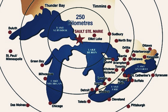 从地理上说,苏圣玛丽位于五大湖最西边的三个大湖苏必列湖,密期根湖和休伦湖的交点上。三个大湖就像三叶草阔大的草叶,分别往东西南三个方向铺天盖地而去,紧紧并在一起的叶蒂就是美丽的苏圣玛丽双子城。如果以苏圣玛丽城为圆心画同心圆,五百公里半径上是五大湖上的城[
