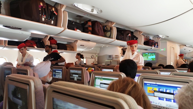这还是我们第一次乘坐阿联航的航班。过去听说过阿联航与众不同,亲身体验后觉得这次选择阿联航是明智之举。多伦多飞迪拜的是空客的巨型机A380-800,最大载客量为850人,但通常只设580个座位。所以和其它客机相比,A380的座位宽大多了,感觉很舒适。空姐的服饰也与众不[