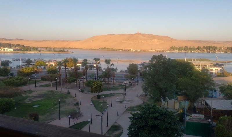可能是前两天在飞机火车上太累了,到阿斯旺后的那天晚上我们倒头睡下去后一夜没醒过。次日早晨睁开眼晴一看,已经是早上六点过了。窗帘外面天色大亮,朝阳下尼罗河对岸边沙红色的岩山颇为让人瞩目,但还是没法和太阳初升时那种"日照金山"的景象相比拟的。