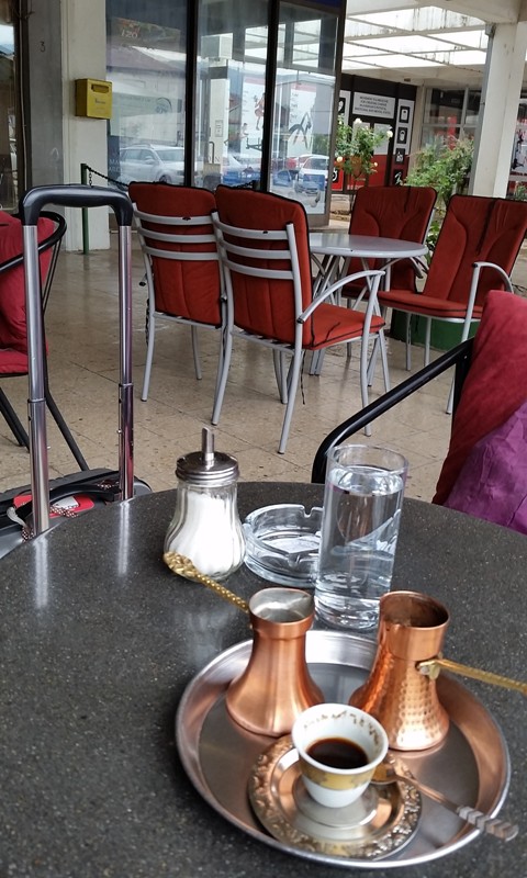 去杜布洛夫尼克的大巴发车时间是下午12点半,当时看还有半个多小时的富裕,我们就去旁边的咖啡吧用剩下的一个波西尼亚马克买了杯咖啡。咖啡装在小铜壶里,另一个小壶是牛奶,还给了一杯清水。一马克相当于半欧元,这杯咖啡是整个欧洲之行最价廉的了。