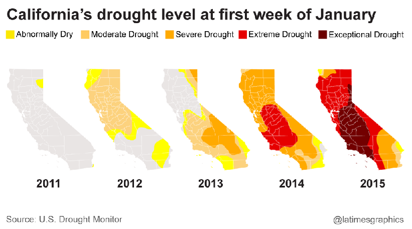 不久前笔者去德州赶上发大水。这和加州的大旱灾形成鲜明对比。加州连续4年大旱使得许多河流,水库和湖泊干涸(图1-3)。来自美国宇航局的卫星数据显示,萨克拉门托和圣华金河流域水的储存总额,包括所有的雪,河流和水库蓄水和地下水,比2014年的正常保有量少近420亿立方米。这相当美国最大的水库米德湖(LakeMead)近1.5倍的蓄水量。自2011年进入干旱期后,全加州每年[