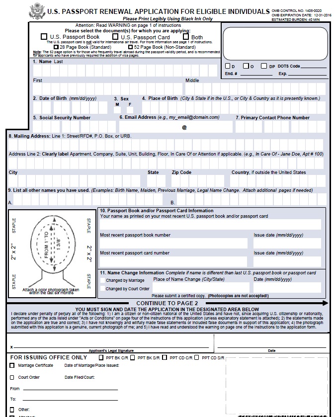 因现有护照过期,需要申请新护照(PassportRenew)。笔者于是填写DS-82申请表(图一),并与旧护照,申请表和申请费支票一并寄出。每个护照申请费需要$110,其中包括申请费和返回的邮寄费。等了大约三个星期后收到新护照,又过了两个星期收到打了孔的旧护照(图二)。