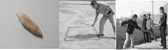 这里所说的“尜“(ga2)不是用鞭子抽的那种陀螺,而是用木头做的长三寸左右,粗一寸左右两头尖的木橛子(见图1左)。[