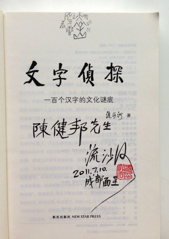 流沙河是四川成都的文化名人,近年陸續出版了:《流沙河認字》、《文字偵探:一百個漢字的文化謎底》、《白魚解字》手稿影印本、《白魚解字》排版本,都是從漢字由甲骨文、金文、篆文、古寫、到正體的演變,去探討漢[