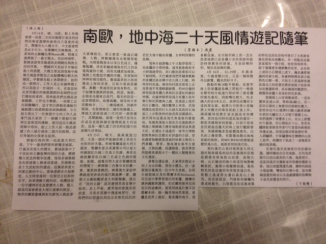 4月14日,晴,18度。船上每晚会将一份第二天的活动节目表送到房间供乘客选择和参与自己喜爱的项目,简报有七,八种文字,中文版当然是必不可少。在歺厅吃完晚歺后,大家相约去舞厅先学Mambo舞,然后又尽兴跳了一会才散去,而此时酒吧,歌舞表演等活动还只是刚刚拉开夜生活的序幕,一觉睡到天亮似乎并无在船上的感觉,大概主要是因現地中海无大风浪季节加[