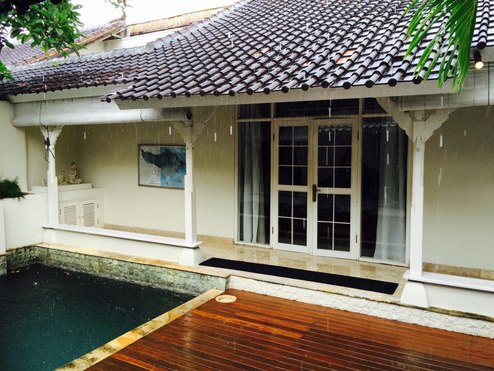 澳农现在巴厘岛虽说是雨季,但也不像是中国南方阴雨绵绵,无休无止整天的下雨“清明时节雨纷纷,路上行人欲断魂”。在乌布的那二天,每天下午3,4点钟左右下一场雷阵雨,过后便是时晴时阴的天气但不再有雨。来到水明漾地区则是毎晚上半夜下场大雨,早晨起来院子里走道上,泳池边留着湿漉漉的雨迹,空气也格外的清新。一夜好睡到第二天早上自然醒,先来场[