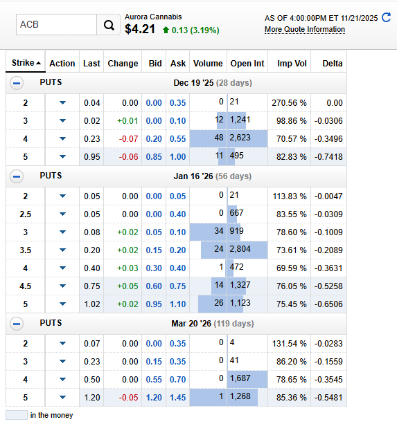 上一篇提到我的ACB持仓过重,11月21日到期的$4扑特有一千多个,本星期很幸运地减持了一些。尽管财报不好,大盘低迷,ACB这家个股被打压,几次下跌至$4.37附近,但表现顽强,收盘又拉上来。