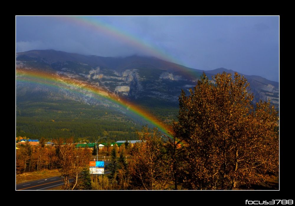 初到加拿大落基山地,最明显的感觉莫过于湿润清爽的空气。这对于久居干旱之地加州的我们来说真是深入肺腑的享受。从机场出发还是艳阳高照,到了坎莫尔附近竟淅淅沥沥地下起雨来。最美妙的是,阳光穿透团团簇簇的雨云渲染出半[