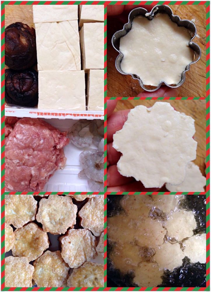 梅花三弄的做法:材料:豆腐一盒、猪肉末300克、水发香茹5-6朵、虾仁若干。调料:料酒、生抽、胡椒粉、盐、糖、姜葱。做法:猪肉末加入剁碎的水发香茹和虾仁加料酒、生抽、胡椒粉,姜葱碎搅拌均匀备用。一弄:豆腐用模具压成梅花状,放油锅炸金黄色,捞出沥干备用。二弄:待炸好的豆腐稍凉,用剪刀横着剪开3/4的口,用一小勺挖空里面的豆腐,嵌入预先调好味的猪[