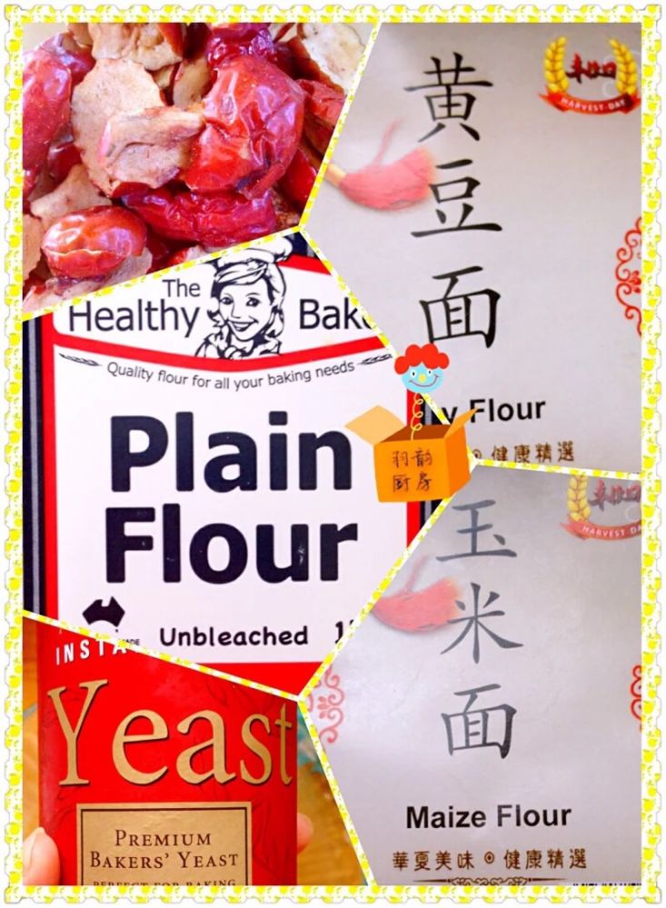 材料:面粉150g、黄豆面100g、玉米面100g、去核红枣50g、酵母和白糖少许。