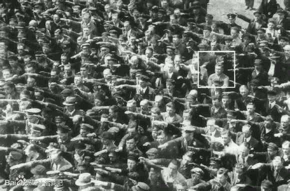 1936年汉堡,船厂工人们在观看纳粹海军训练舰下水仪式。在向纳粹致敬的人海中,只有这名男子拒绝举手。此前,因为和一位犹太女人结婚,他已被判两年苦力。二战中失踪。1949年被宣布死亡。1991年这张照片刊登时,一名女子认出这是她的父亲,这个男人的名字叫AugustLandmesser。