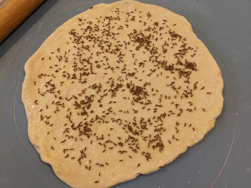 上圖:撒上藏茴香籽的餅胚。下圖:烙好的樣子。外子喜歡吃一種叫做CarawaySeedBread,當時是要在猶太食品專門店才買到,後來在其他賣歐洲食品的店也有這種麵包賣了。這種麵包吃起來有種特殊的香味,吃幾次後就會喜歡上那種特殊味道了。CarawaySeed的中文是藏茴香,是一種非常古老的香料,遠從石器時代就開始爲人們所食用。埃及人習慣用藏茴香爲食物調味,而在埃及人的[