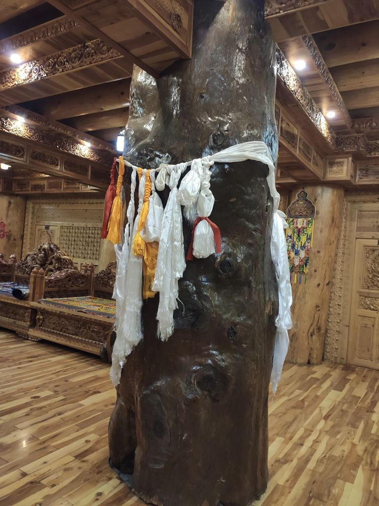 (酒店大堂里的一根柱子,一整根木头,三人合抱,据说是根神木)