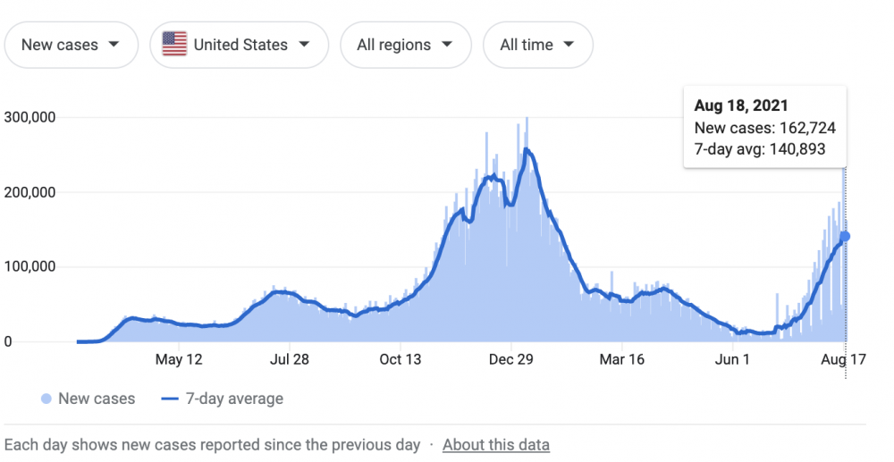 1)美国NIH主任柯林斯周日说,未来两周美国每日新冠新病例会达到到每天超过20万病例,这意味着今年这个夏天每天病例数会超过去年冬天(2020年底-2021年初),顶部还未形成,当然是以未接种疫苗的人群感染为多。2)美国四分之三以上的州每周死亡人数正在上升。约翰霍普金斯大学的最新统计数据显示一周内有4,800多人死亡。这是7月初相对平稳的数字的三倍多。死亡人数实[