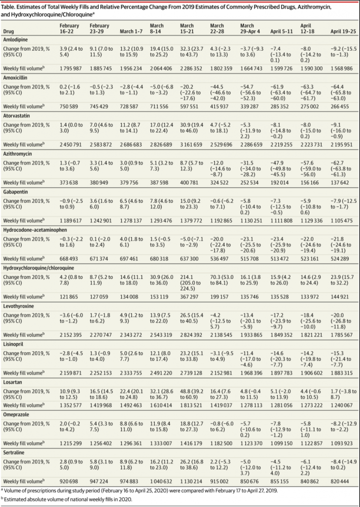 ?冠状病毒病-19(Covid-19。新冠)大流行改变了一切,也改变了医生开药,病人吃药的习惯。波士顿的一帮医生(Warraich等)还特地为此做了一项研究,看看Covid-19大流行期间美国病人吃药的流行趋势。新冠流行开始后,讨论最多的药物当属羟基氯喹/氯喹和阿奇霉素,这款药物甚至变成了政治风向标。此外,还有与降压药ACE有关药物,例如血管紧张素转换酶(ACE)抑制剂和血管紧[