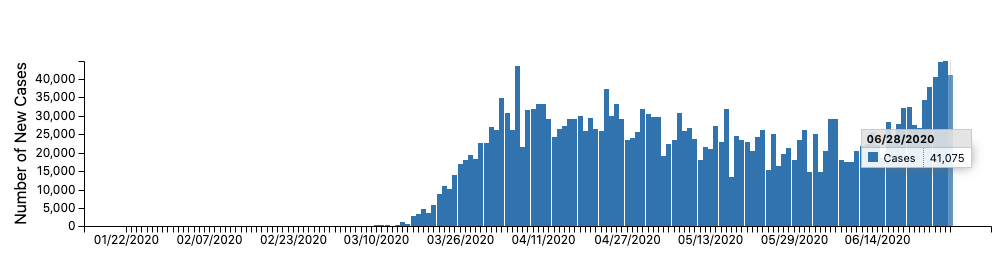最近几天,美国新冠(COVID-19)病例又开始显著的增加。特别是在南部各州,比如佛罗里达州,得克萨斯州还有西部加利福尼亚州等。佛罗里达州前两天每天新增阳性数目近万(今6/29降至5000余),这个增加的原因可能与早期复工,抗议示威等等有关,加上许多人没带口罩,没有能保持社交距离是另外一些原因。那么这个突然的增加的病例数,是否意味着第二波新冠病毒感染到了[