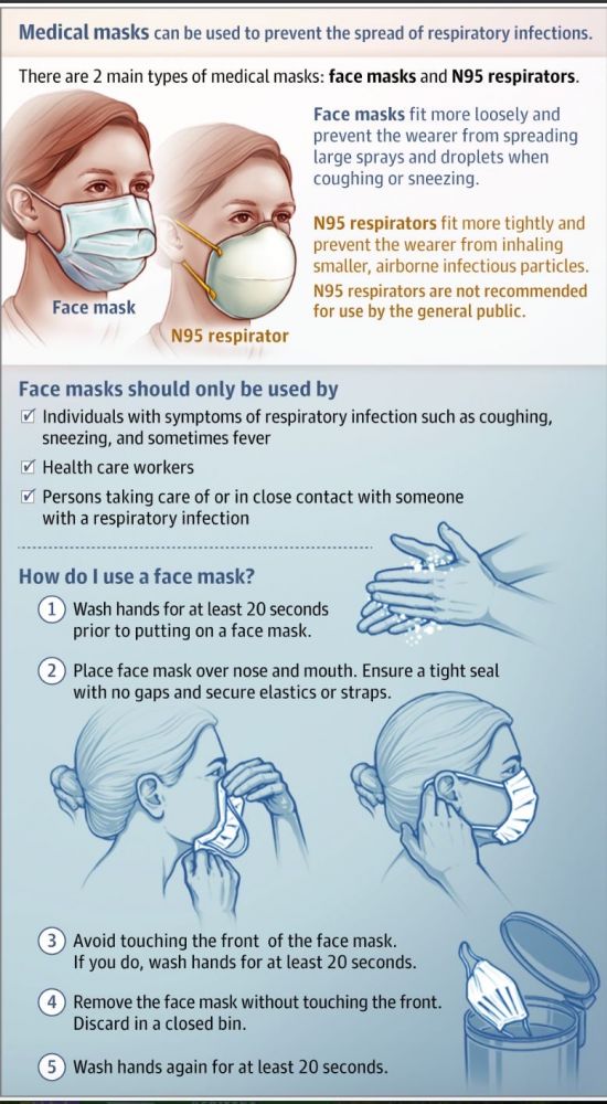 有两种主要类型的口罩用于预防呼吸道感染:手术口罩(有时称为面罩,简称口罩)和N95呼吸器(呼吸防护口罩)。