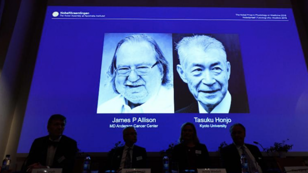 诺贝尔生理学或医学委员会今天早上宣布,2018年诺贝尔医学及生理学奖授于一名美国人詹姆斯.阿里森及一名日本人TasukuHonju。两人共享约一百万美元的荣誉,以表彰两人分别在开创癌症免疫治疗方法上作出的杰出贡献。美国人JamesAllison和日本的TasukuHonjo赢得了2018年诺贝尔医学奖。诺贝尔生理学或医学委员会的成员坐在显示JamesAllison(L)和TasukuHonjo的屏幕前。诺贝尔委员会表示,[