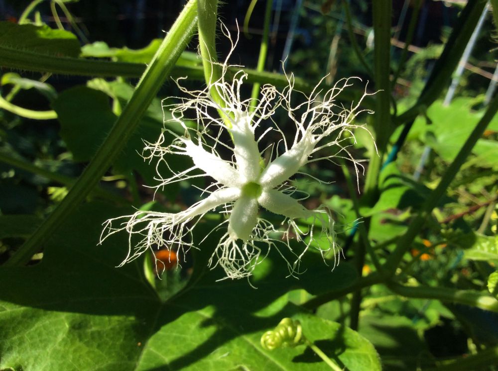 在春天的农交会得到了一些从来没听说过的瓜果种子,好奇地把它们种在菜园里。两个多月后就看到了从没看到过的花