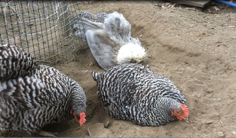 泥沙浴不仅让鸡有健康美丽,富有光泽的羽毛,还能去除多种寄生虫。鸡都懂得在哪里建造泥沙浴场,一般是土质松软,晒得到太阳的地方,但有些角落却是你意想不到的。有几次走路没看地下,一脚踩到一个大坑里,差点摔跤,才发现走到了小鸡刨出的泥沙浴坑里。