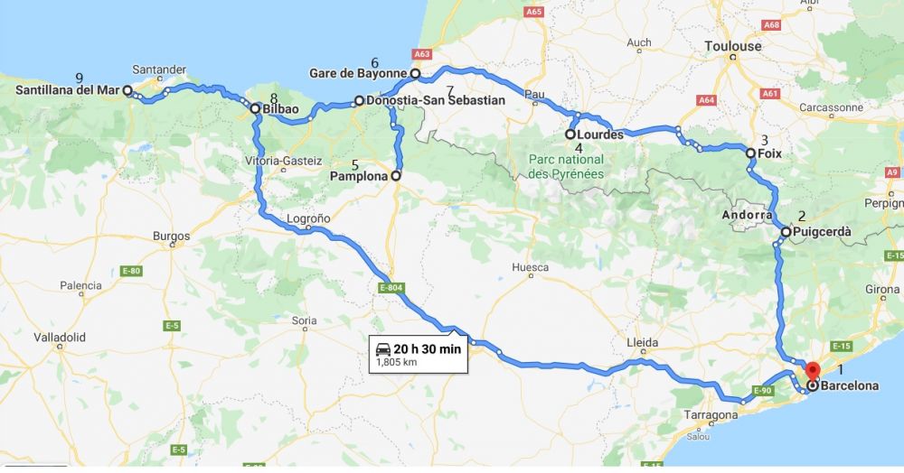 这次的旅行主要目的地是西班牙和法国交界的比利牛斯山中或附近的小城镇,由东向西行。我们飞到巴塞罗那,休息两天后,然后朝北开进山,最后由西班牙北部直线回巴塞罗那。