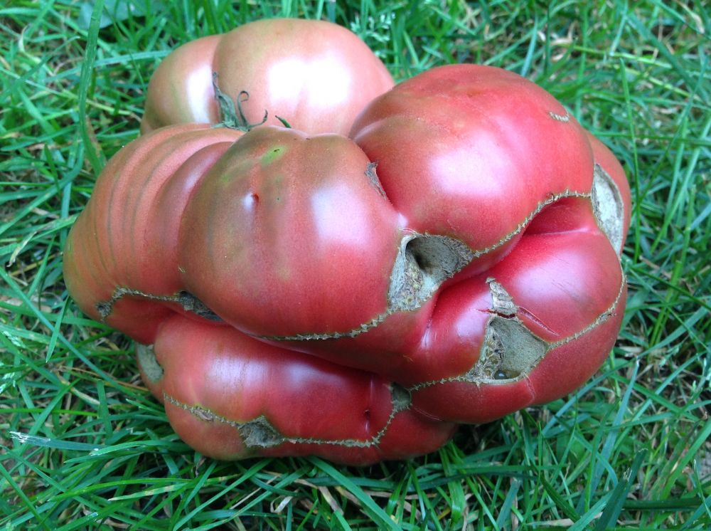 西红柿7月下旬开始陆陆续续地成熟了!最开始摘到的小黄西红柿甜的俺心里都美美地笑!这次收获到几个怪物。看上面这个西红柿到底是几面体?还能再复杂一些吗?长的这么怪怪的都不知说你什么好了!跟小黑西红柿比较一下,简直就是个庞然大物:过磅吧,没啥不可示人的:一起收获的还有下面这个怪物:到底是几楞啊?你一个芸豆学四棱豆干啥呢?又学不像,东施效颦[