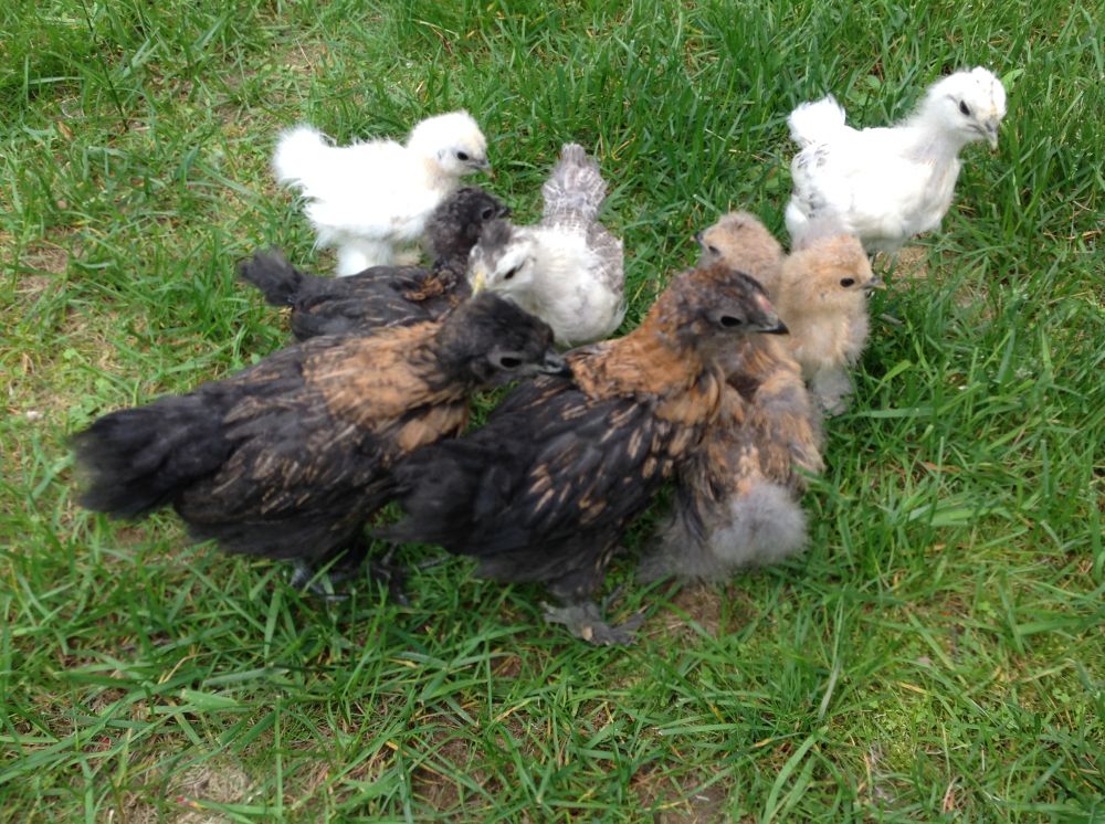 乌鸡比较胆小,小乌鸡更胆小,站在草地上好半天不敢挪步。到鸡窝里请出他们的老妈跟他们一起玩壮壮胆儿,曾经在这老妈暖和的肚皮下待了21天,当然这些小鸡里面也一定有这老妈的嫡生儿女。