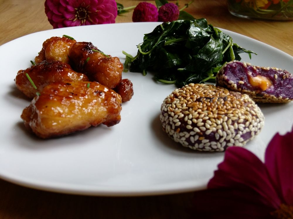煎紫薯饼,清炒辣椒叶,配orangechicken: