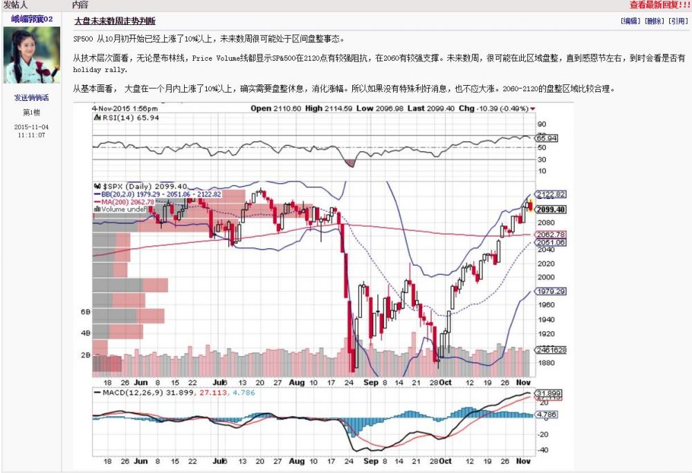 从技术层次面看,无论是布林线,PriceVolume线都显示SP&500在2120点有较强阻抗,在2060有较强支撑。未来数周,很可能在此区域盘整,直到感恩节左右,到时会看是否有holidayrally.